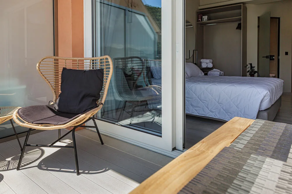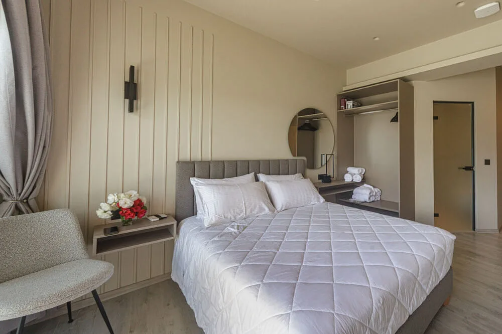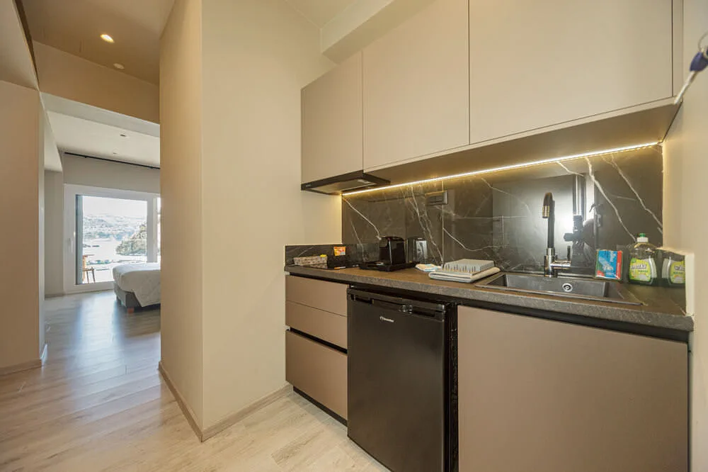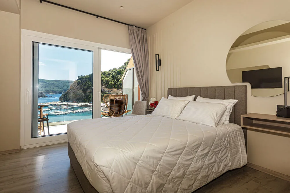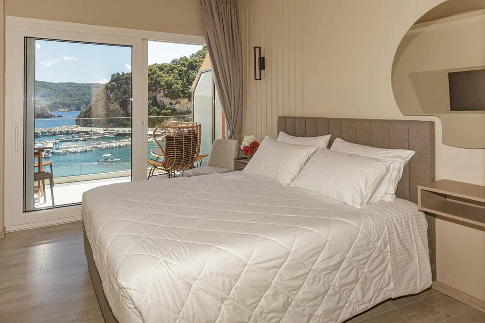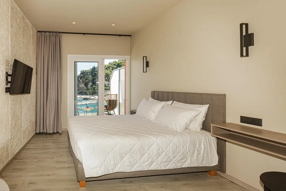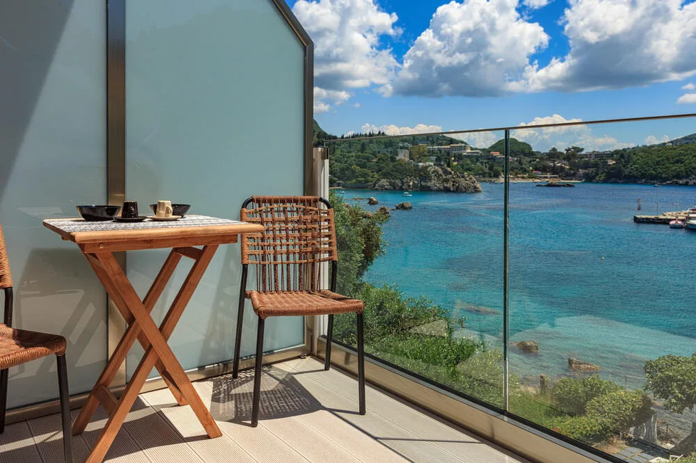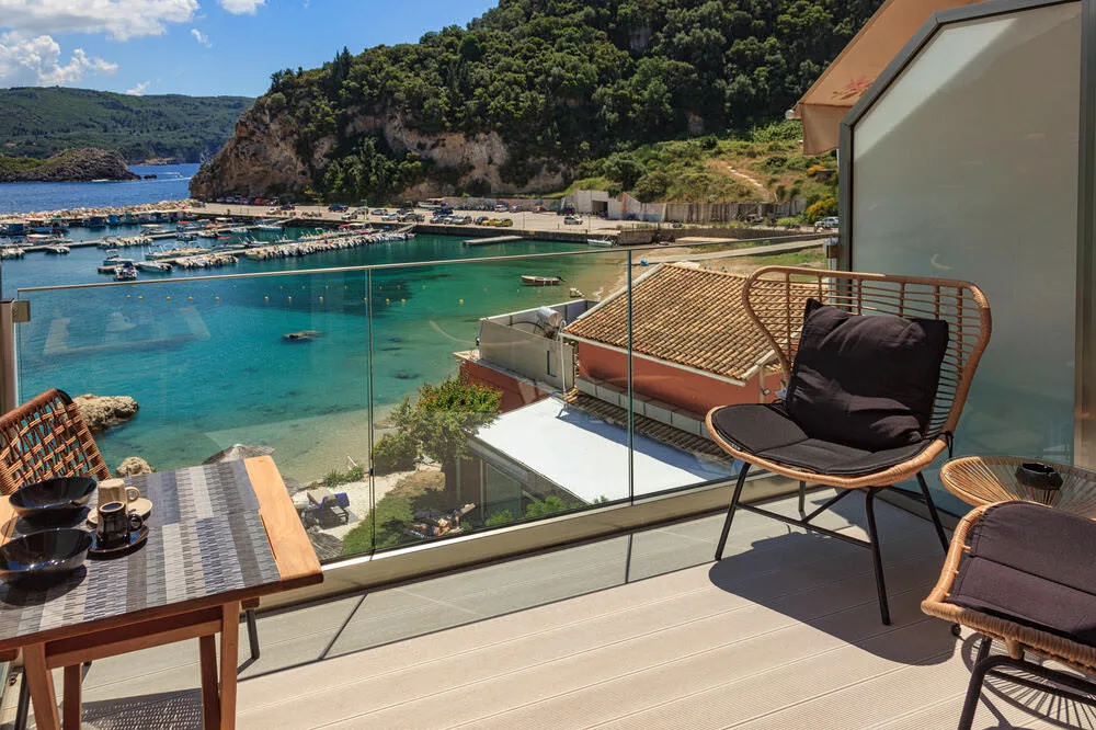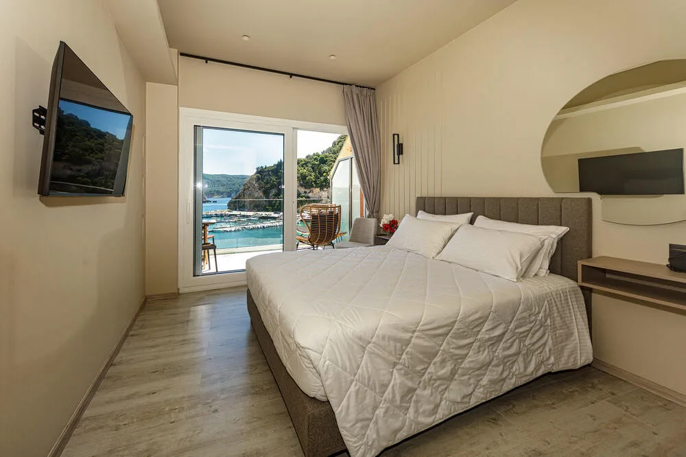 Perched on the upper floor and freshly renovated, this stylish sea-view studios offer a breathtaking panorama of the iconic Paleokastritsa Bay right from your private patio. Designed for comfort and convenience, they features a modern, fully equipped kitchenette, a sleek plasma TV, and refreshing air conditioning.